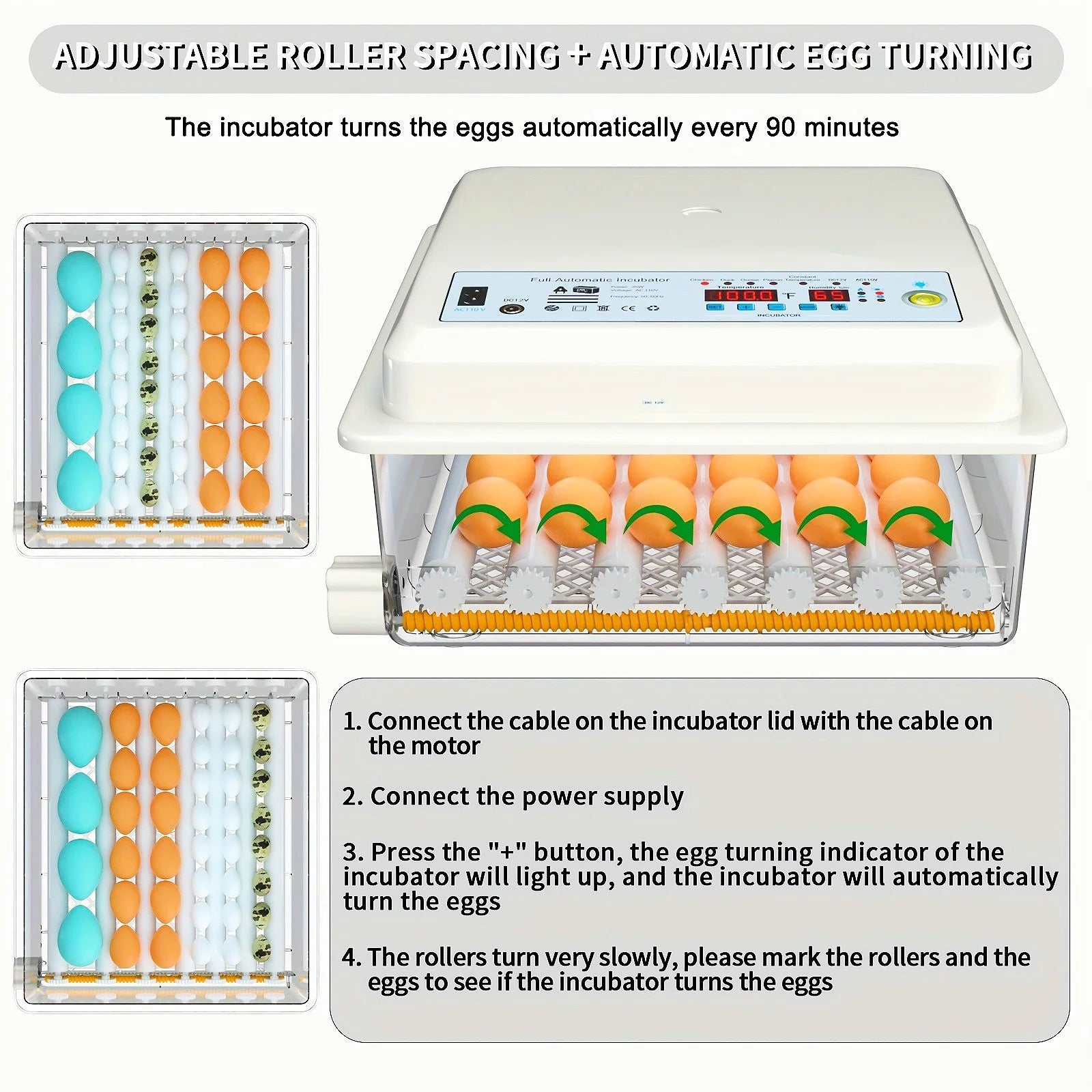 - Adjustable roller spacing lets you fit 12-16 eggs, 6-9 duck eggs, or 24-32 quail eggs, with a precise temperature and humidity readout on the screen.